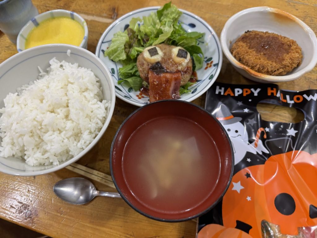 ハロウィン♪(10月31日) 2025.11.102025.11.25 10月31日はハロウィン♪この日の夕食には「おばけハンバーグ」「かぼちゃコロッケ」「かぼちゃプリン」などなど、ハロウィンやカボチャにちなんだスペシャルハロウィンメニューでした! 味はもちろん、見た目も可愛く食べるのがもったいないほどでした。 おやつは「ハロウィンお菓子の詰め合わせ」♪ハーベストさんが心を込めて一つ一つ袋詰めして下さり、色々なお菓子を楽しむことができました。今回もハーベストさんには、季節感たっぷりで工夫を凝らしたメニューを提供して頂き、感謝の気持ちでいっぱいです。