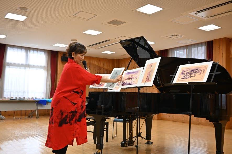 昨年に引き続き「石塚まみライブ&ワークショップ」を奥多摩福祉会館にて開催しました。ピアノを囲んで、それぞれ自由に石塚まみさんの音楽を楽しみました。椅子や座布団、バランスボールに座って聴く人や、絵を描いたり、踊ったりしながら聴いている人たちもいました。